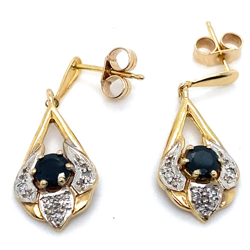 9CT YELLOW GOLD ROUND SAPPHIRE AND DIAMOND DROP STYLE EARRING