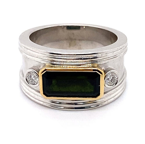 18CT WHITE GOLD RAIL EDGE TOURMALINE & DIAMOND DRESS RING VALUED @ $10799